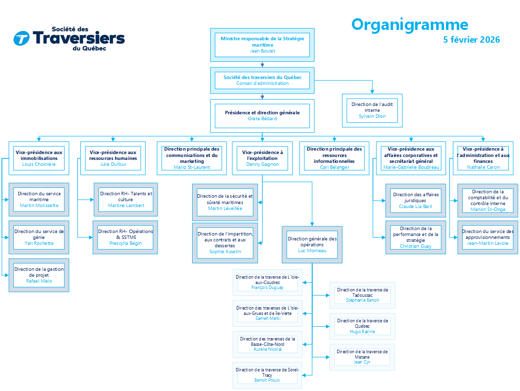 L'organigramme présente la structure administrative de la STQ et le partage des responsabilités de gestion. Cet organigramme regroupe le nom et les titres des membres du personnel de direction ou d'encadrement.