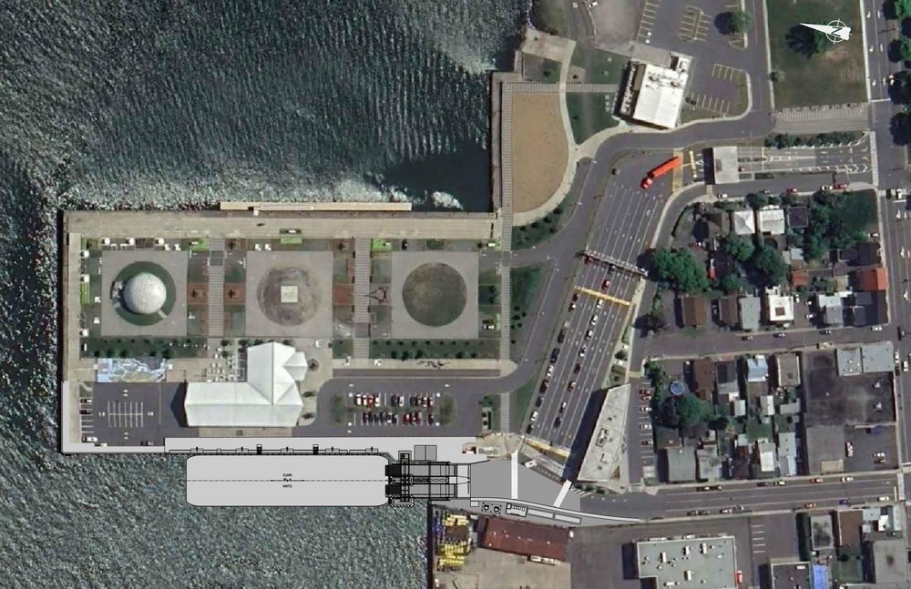 - Phase 1 : construction des installations temporaires incluant une culée ou une jetée et une rampe mobile d’embarquement installée sur caissons flottants modulaires;