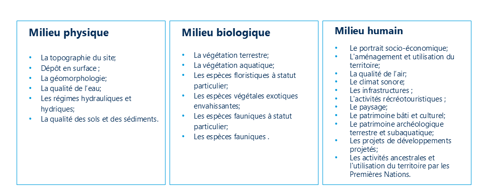 Biologique (Inventaires : faune, oiseaux, poissons, flore);