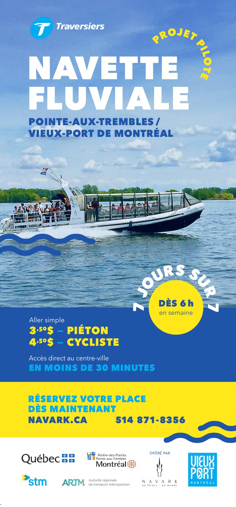 Cet été, gagnez du temps dans vos déplacements et profitez d'un moment de détente sur le majestueux fleuve Saint-Laurent. De retour cette année pour une période prolongée, le projet-pilote de la navette fluviale assure une liaison entre le Vieux Pointe-aux-Trembles, au coin du boulevard Saint-Jean-Baptiste et de la rue Bellerive dans l'arrondissement Rivière-des-Prairies–Pointe-aux-Trembles, et le quai Jacques-Cartier dans le Vieux-Port de Montréal.